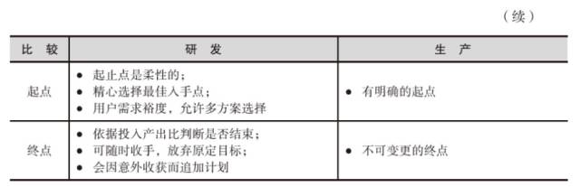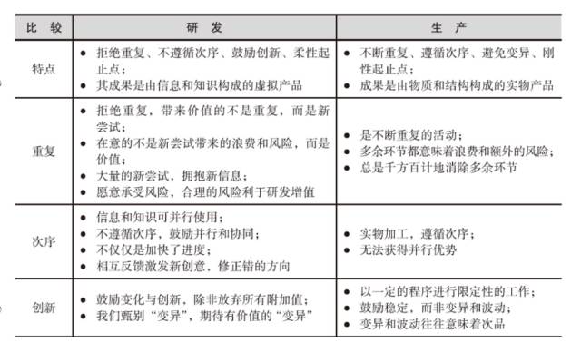 我们通过研发和生产的比较来说明这种差异。生产的总体特征是:不断重复、遵循次序、避免变异、具有刚性起止点,其成果是由物质和结构构成的实物产品。
