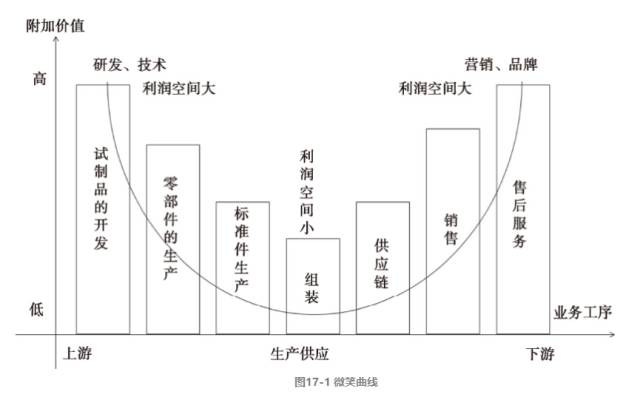 泰勒的科学管理和大规模生产就是在这样的时代背景下产生的。随着工业发达程度的提升,在供大于求的年代,能高效率、低成本地制造和供应产品的能力决定了竞争力。精益生产就是在这样的时代背景下产生的。随着工业的进一步发展,在物质极大丰富的年代,人类开始追求差异化和个性化,产品研发和商业模式的创新能力决定了竞争力。最反映这个特征的是“微笑曲线”(Smiling Curve)模型,如图17-1所示。