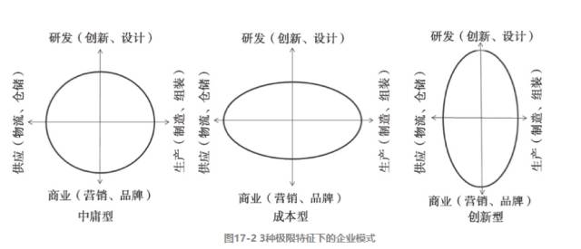 企业有四项基本功能:研发(创新、设计)、生产(制造、组装)、商业(营销、品牌)、供应(物流、仓储)。根据这些功能的强弱不同,会组合形成不同特征的企业。