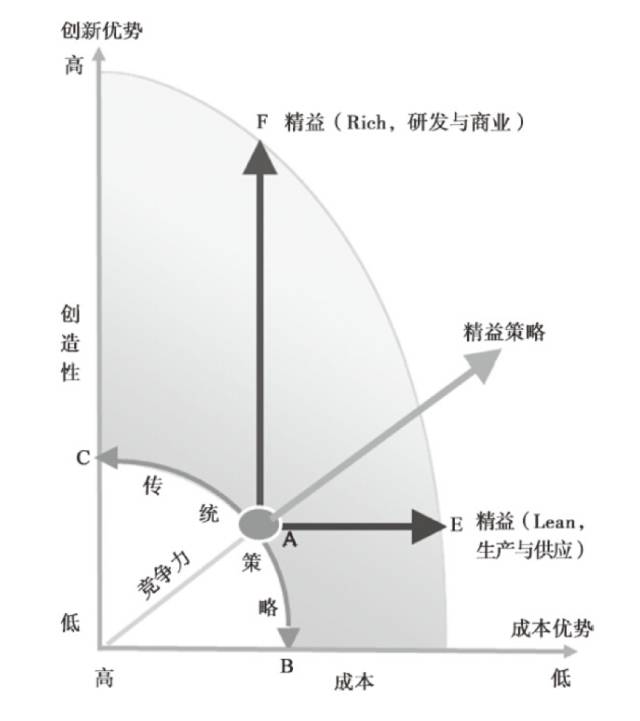 精益研发和精益商业策略则是关注创新的策略(沿着AF射线垂直行进)。该策略在不显著增加成本的前提下,可以提高产品的品质、技术含量和品牌价值,从而提升产品的附加值,达到增加竞争力的目的。采用这种策略,可以比同类产品卖得更贵,但仍然有人买,这就是精良设备和名牌产品。